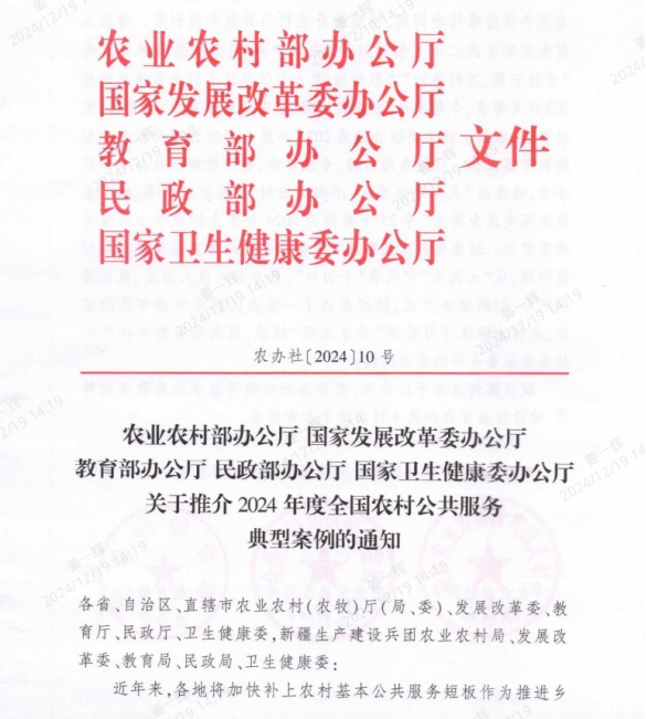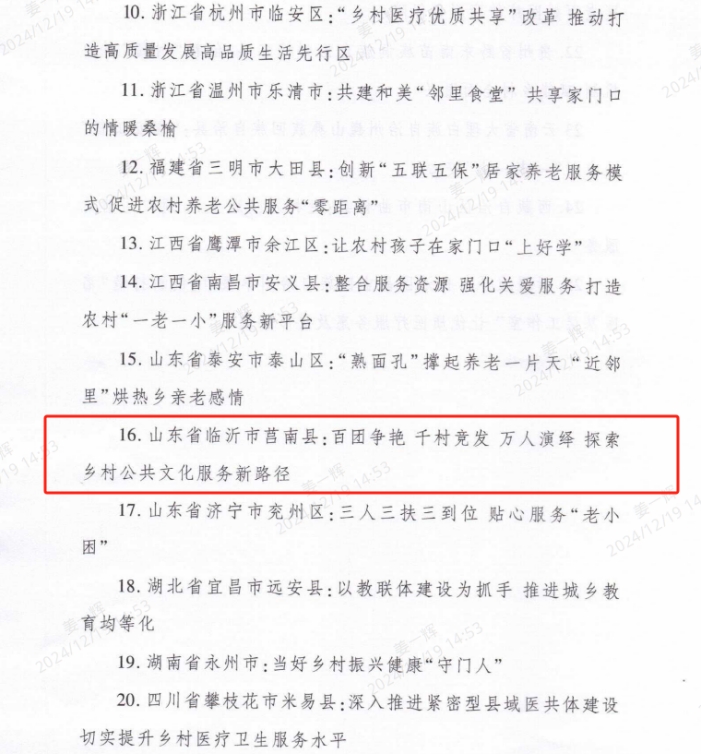 今年5月,农业农村部、国家发展改革委、教育部、民政部、国家卫生健康委联合开展2024年度全国农村公共服务典型案例征集工作。近日,经过各地推荐、专家评审、部门审核和社会公示等环节,我市莒南县《百团争艳千村竞发万人演绎探索乡村公共文化服务新路径》成功入选2024年度全国农村公共服务典型案例。