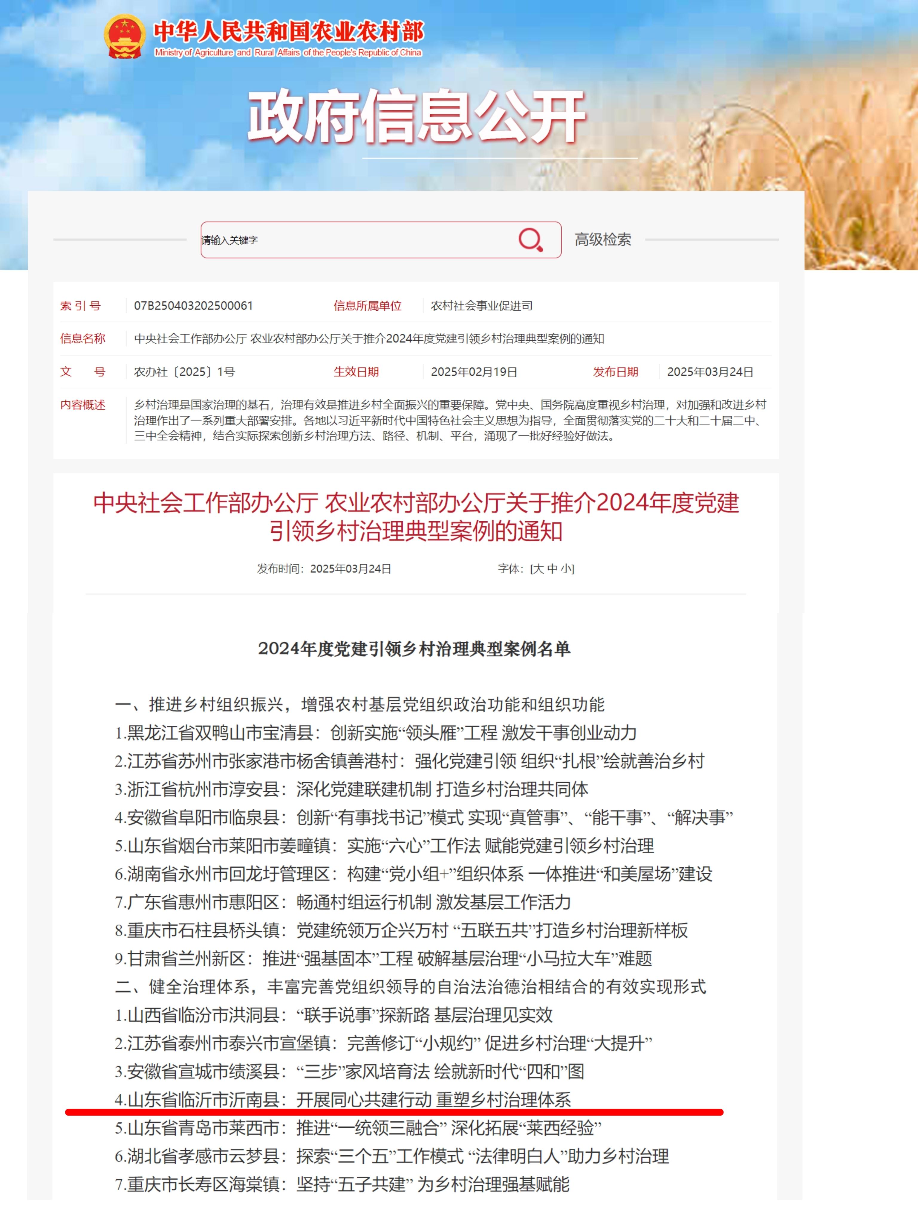 为进一步发挥好党建引领乡村治理典型的示范带动作用,推进健全乡村治理体系、提升乡村治理水平,中央社会工作部、农业农村部联合开展了2024年度党建引领乡村治理典型案例征集遴选,在各地推荐基础上,优中选优确定了46个典型案例,并于3月24日召开视频发布活动。山东省临沂市沂南县《开展同心共建行动 重塑乡村治理体系》案例成功入选,成为全国乡村治理创新实践的标杆示范。沂南县以“党群同心”为核心,探索出组织联动、群众共治、资源整合的乡村治理新模式,为全面推进乡村振兴提供了可复制、可推广的“沂南经验”。