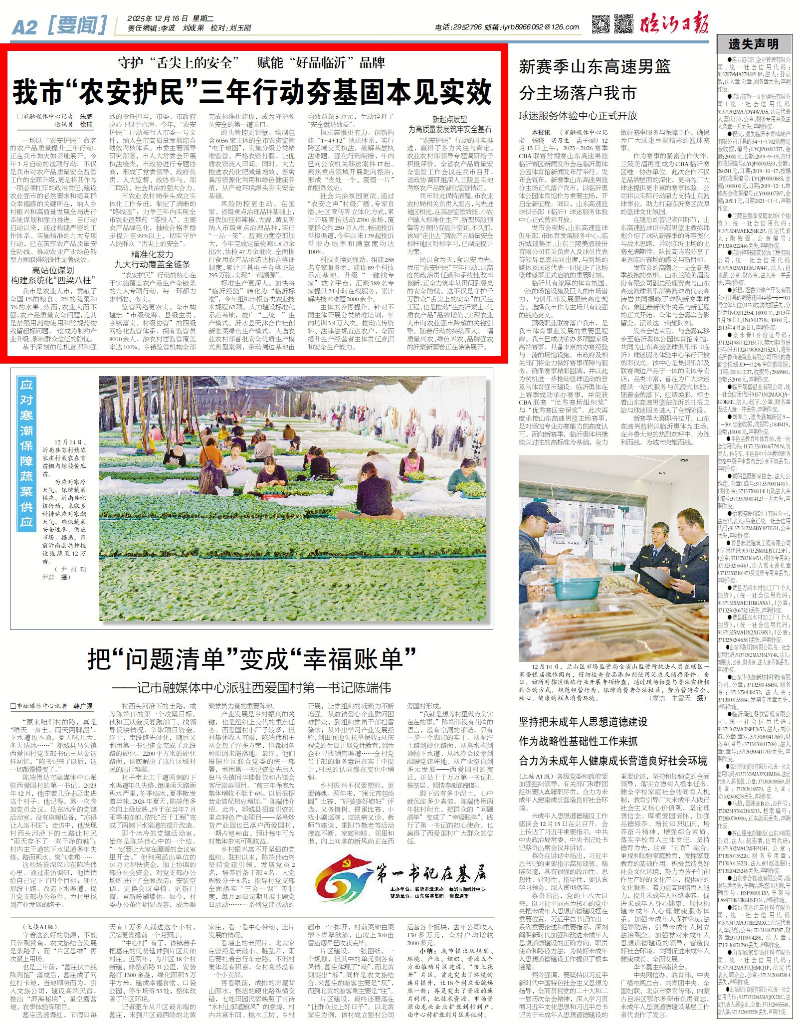 民以食为天,食以安为先。我市“农安护民”三年行动,以高度的政治责任感和系统性改革创新,正全力筑牢从田间到餐桌的安全防线。这不仅是守护千万群众“舌尖上的安全”的民生工程,也是推动“生态沂蒙山、优质农产品”品牌增值、实现农业大市向农业强市跨越的关键引擎。随着行动的持续深入,一幅质量兴农、绿色兴农、品牌强农的沂蒙新画卷正在徐徐展开。