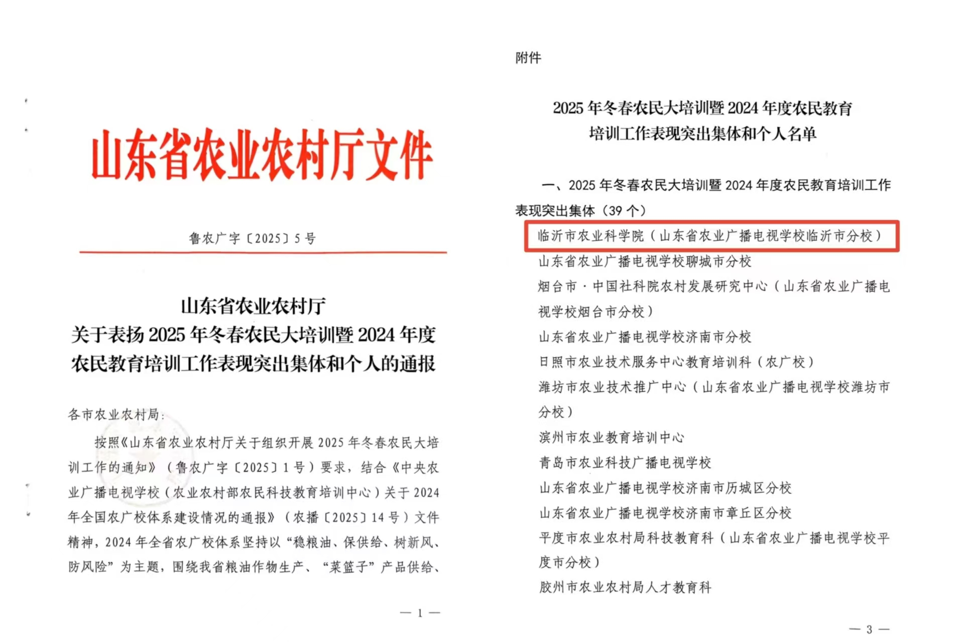 近日,一则喜讯传来,山东省农业农村厅下发的《关于表扬2025年冬春农民大培训暨2024年度农民教育培训工作表现突出集体和个人的通报》(鲁农广校字〔2025〕5号)中,临沂市农业科学院(农广校)凭借突出表现,在全省综合考评中,以总分第一名的优异成绩,被评为表现突出集体。同时,兰陵、蒙阴被评为县级农广校表现突出集体。