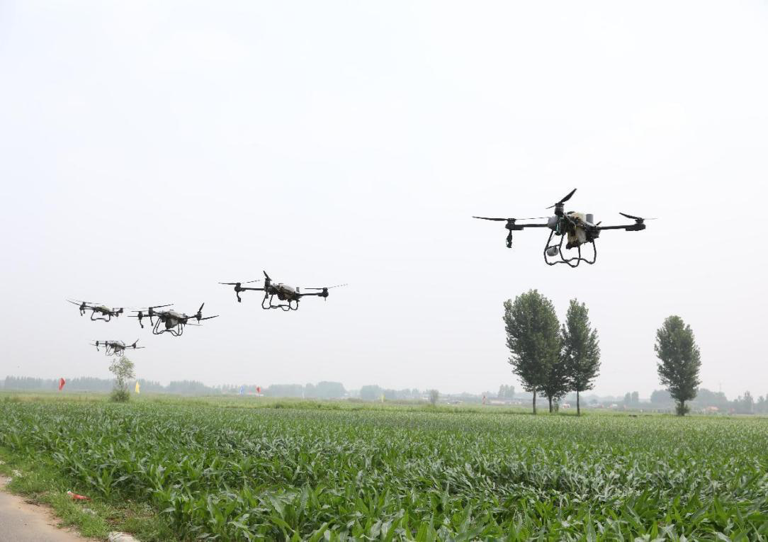 最后,与会人员现场观摩了河东区效来农机合作社的夏玉米密植田间管理现场,合作社社员现场演示了无人机植保作业。
