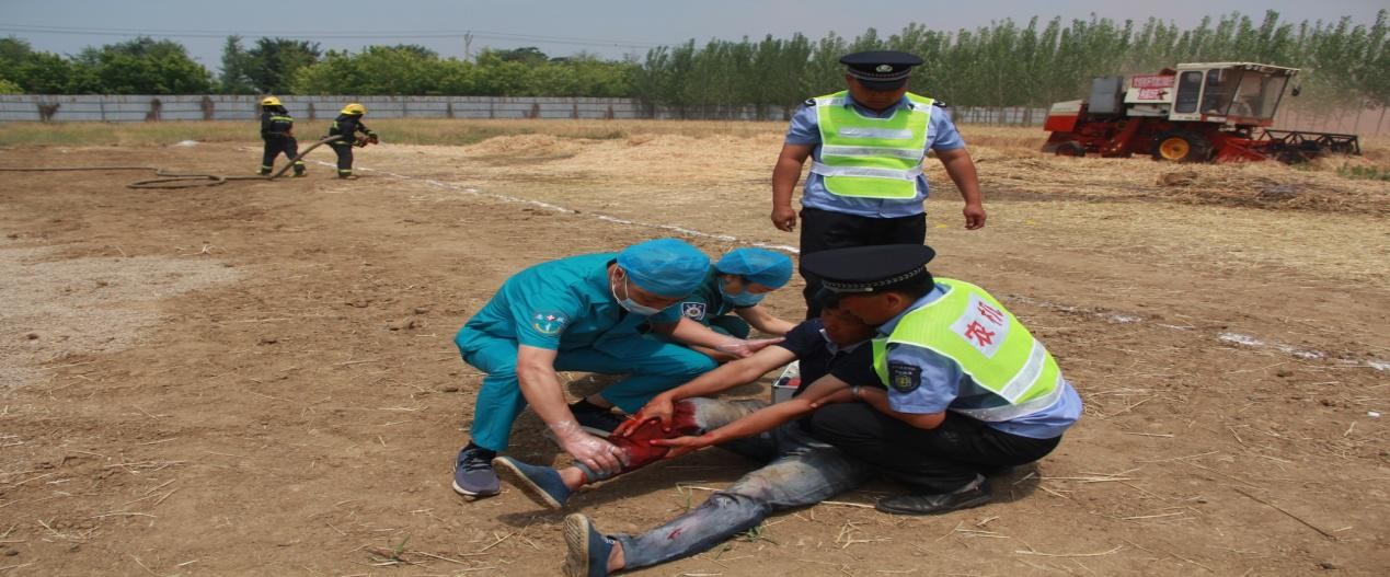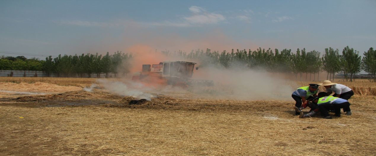 本次演练模拟在费县上冶镇万仓村正北方向2公里远的地方,一台联合收割机在田间进行小麦收割作业时,由于联合收割机线路老化,造成车辆自燃。辅助人员阻停车辆时被车辆撞伤。驾驶员在对车辆进行灭火时,灭火失败,引燃周边秸秆。机械受损严重,一人受伤、农作物受损的一般农机事故。