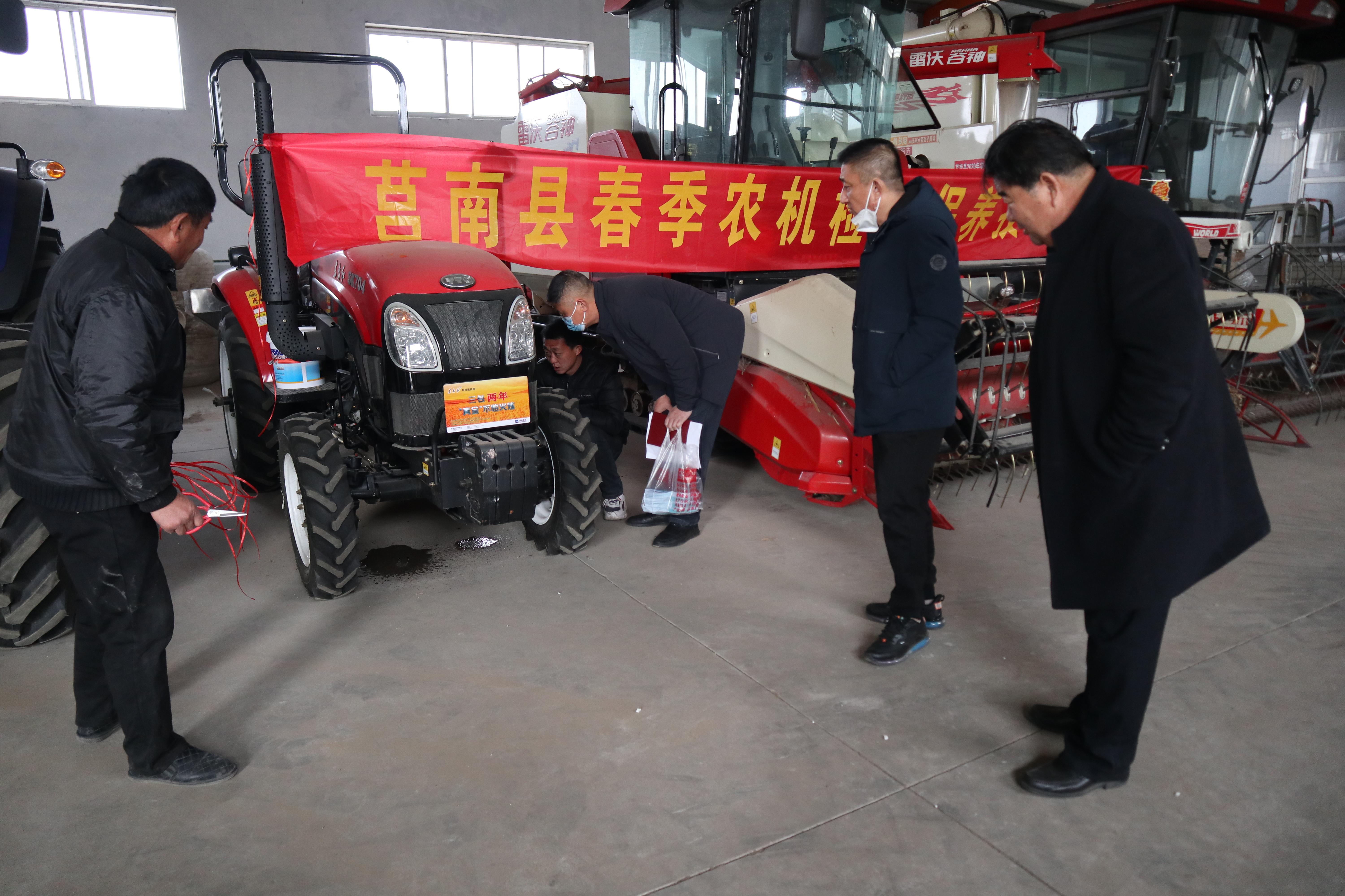 气温回升,春满大地,2023年度的春耕备播即将拉开帷幕。为提高农业机械设备技术状况和驾驶操作人员的安全意识,做好春耕备播,为粮食丰收和重要农产品稳定供应打下基础。2月2日,莒南县农业农村局党组成员、农机中心主任李书兴带队开展农机检修保养、安全教育培训工作。