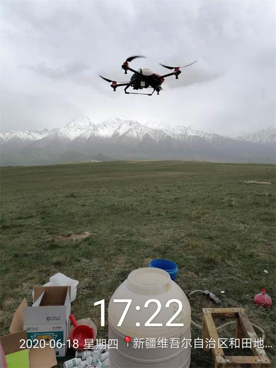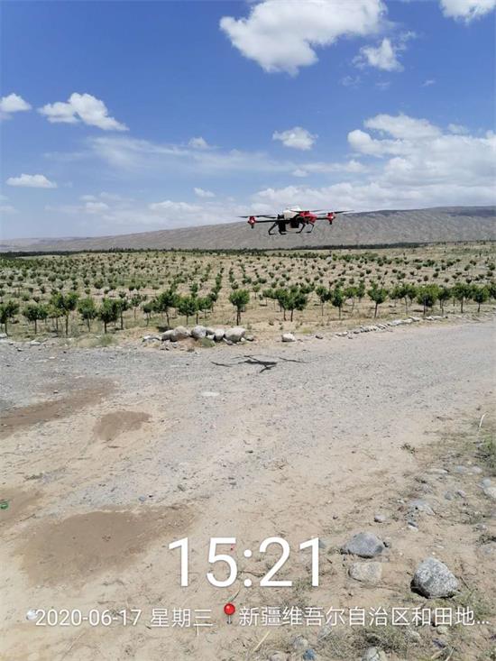 在新疆和田区一片牧草区的上空,从远处看6架无人机正在空中翩跹飞舞,走近一看原来是郯城润丰农业服务有限公司今年新购置的3架极飞无人植保机在给牧草洗“阳光浴”呢。