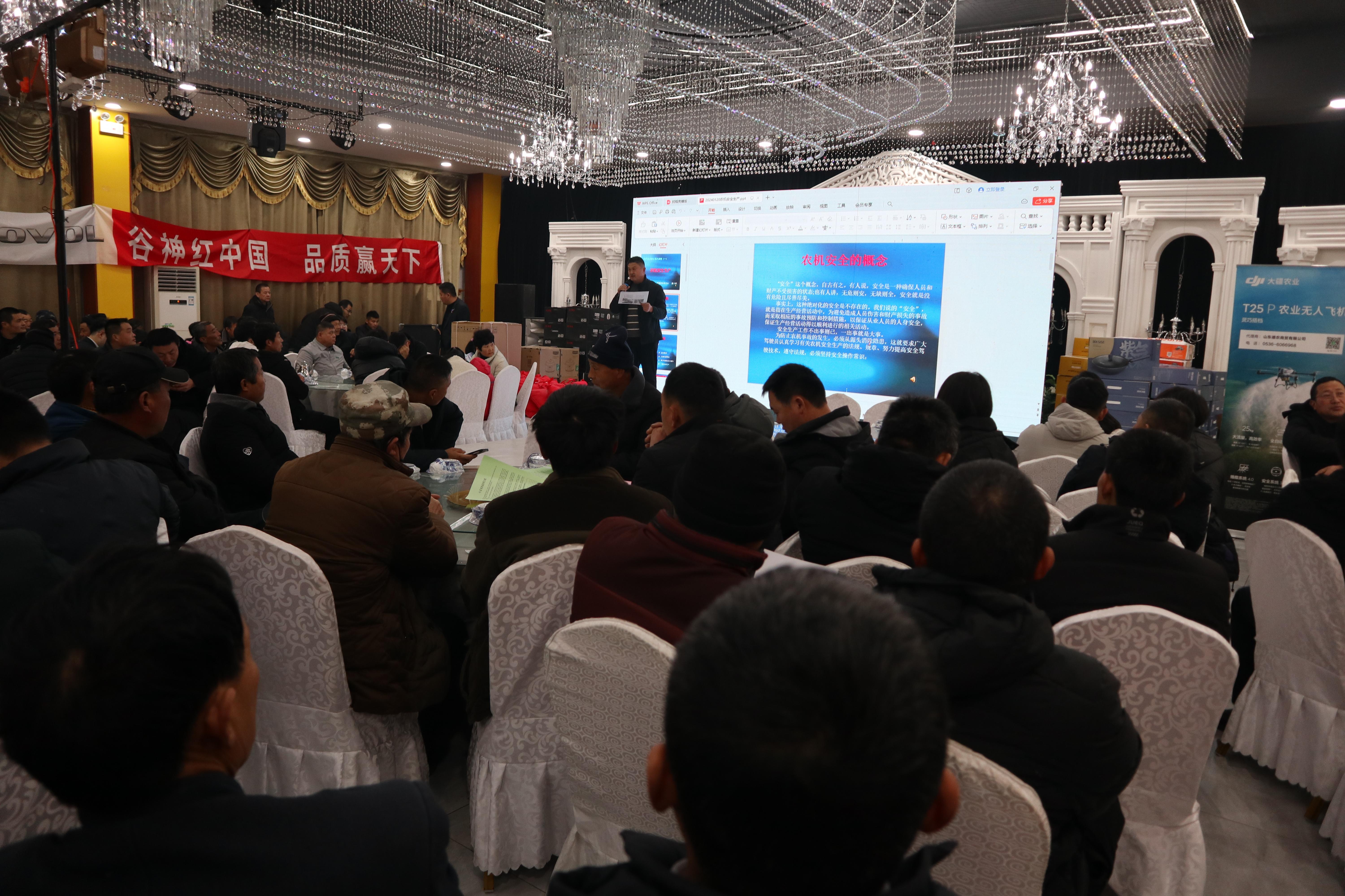 为进一步引导广大农机手了解、认识、使用先进农业机械和技术,提升农业机械化生产经济效益和社会效益。1月20日,莒南县嘉禾农机合作社组织召开新机具新技术推广应用暨农机安全生产培训交流会议,潍柴雷沃、大疆创新、工商银行莒南支行、莒南县农机中心相关工作人员及农机合作社负责人、农机手300多人参加会议。
