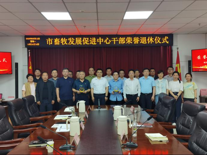 2025年5月12日,临沂市畜牧发展促进中心为中心三级调研员陈淑才同志、中心办公室副主任张华同志举办了荣誉退休仪式。市农业农村局党组副书记、副局长王宁同志出席仪式并讲话,市畜牧发展促进中心领导班子成员,各科室主要负责人,中心办公室和畜产品质量安全促进科全体人员参加。