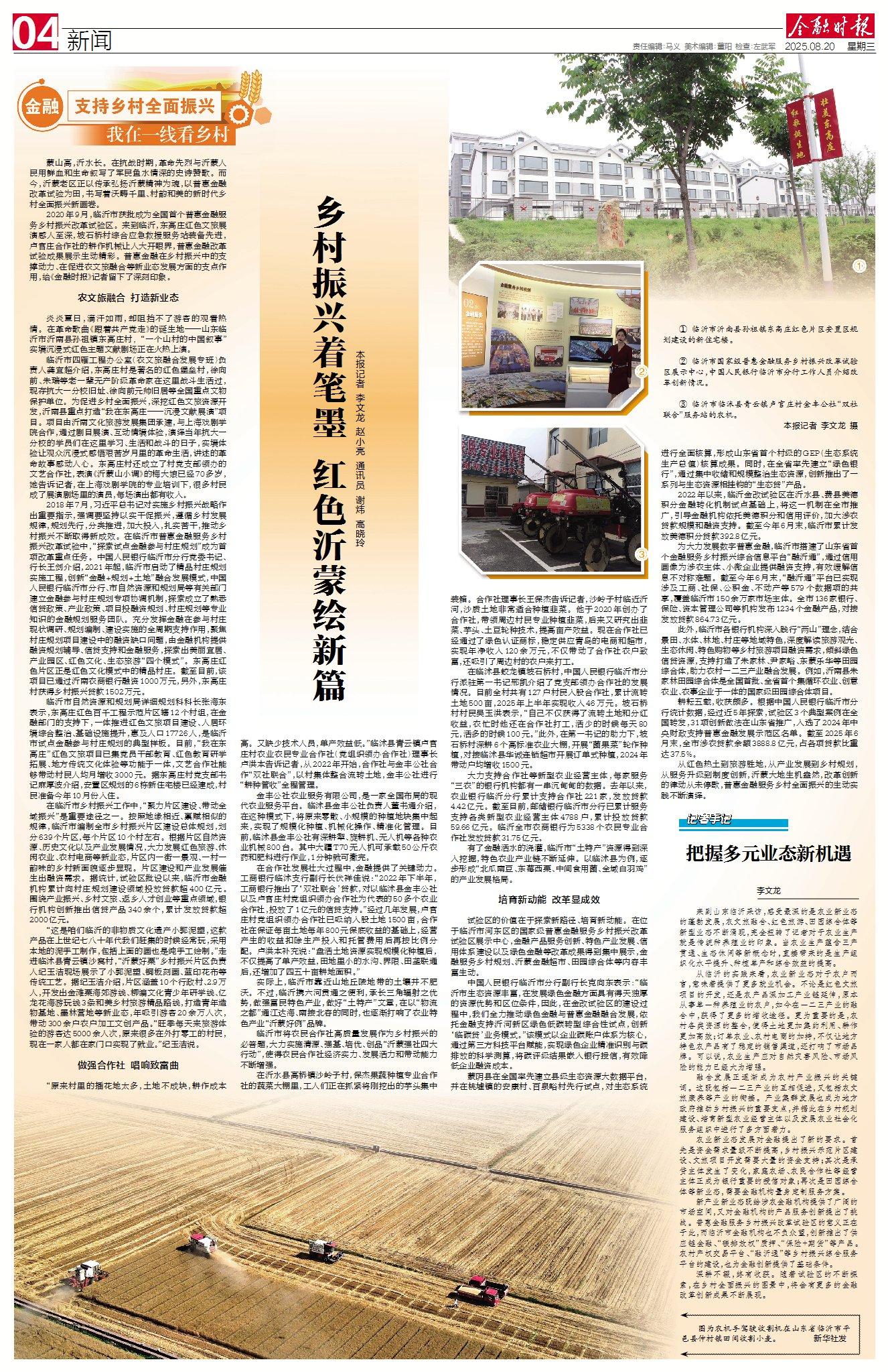 编者按:8月20日,中国人民银行总行《金融时报》刊发《乡村振兴着笔墨 红色沂蒙绘新篇》,对我市农文旅融合发展、金融助力乡村振兴、沂蒙强社等重点工作进行了整版报道。现予以转发,以飨读者。