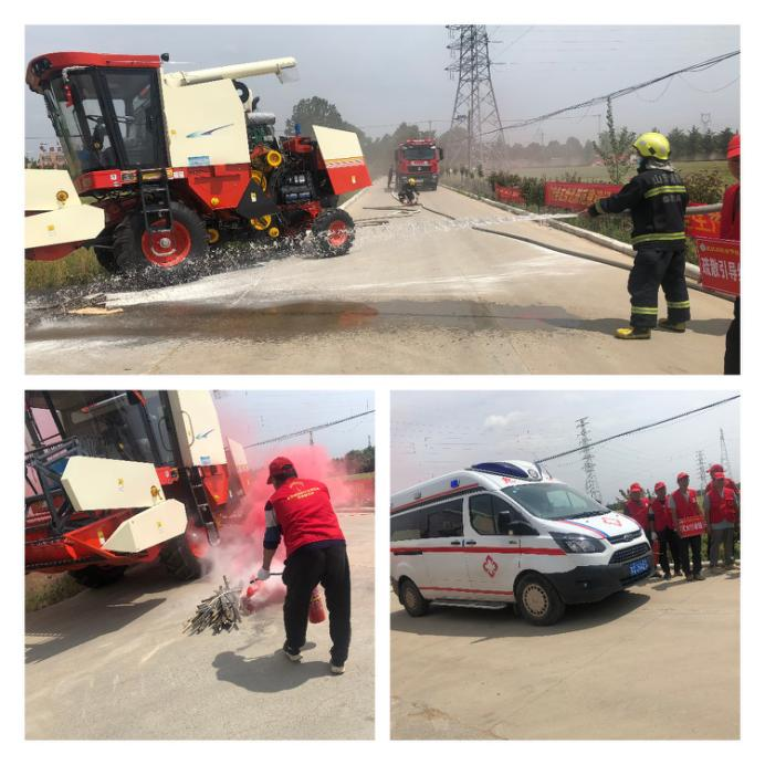 全体参演人员按照农机事故应急救援预案,迅速开展了应急处置工作。演练模拟农机事故现场:农机手驾驶小麦联合收割机作业时,因排气管未安装消防设施,致使火星引燃小麦,进而引燃收割机。农机手发现火情,立即拨打119报警,在及时向合作社应急领导小组进行报告的同时,用自带的灭火器开展自救。合作社立即向区农业农村局、区应急管理局汇报。区农业农村局启动应急救援预案,立即赶赴现场,指挥现场救援。