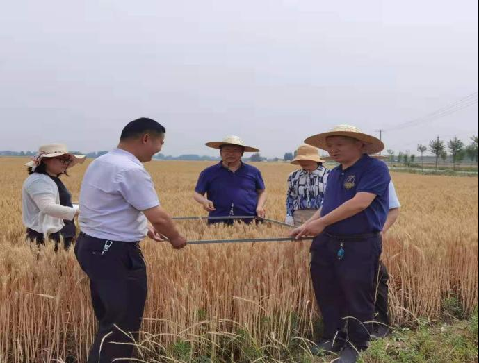 为了进一步明确小麦条锈病发生对小麦产量损失的影响,6月2日,临沂市农业农村局植保站站长、研究员徐德坤一行三人到兰陵县苍山街道上砚台村小麦条锈病发病程度较重的麦田,对防控后的条锈病病点麦田进行调查标记和产量实测,县农业农村局副局长谭常伟及植保技术人员陪同测产,选小麦品种相同的条锈病病点防控区和未发病点普防对照区分别进行。每个测产区随机抽取3个点,每点调查1平方米有效株数和成穗数,并随机取100株计算平均穗粒数和千粒重。