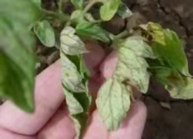 植株瘦弱、萎蔫,心叶边缘发黄皱缩,严重时心叶枯死,植株中部叶片形成黑褐色斑,后全株叶片上卷。很系不发达。果实易发生脐腐病及空洞果。