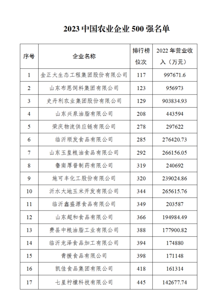 近日,农民日报社和全国农业企业发展联盟共同发布“2023中国农业企业500强”榜单,其中,临沂市17家企业上榜,营收达到611亿元。
