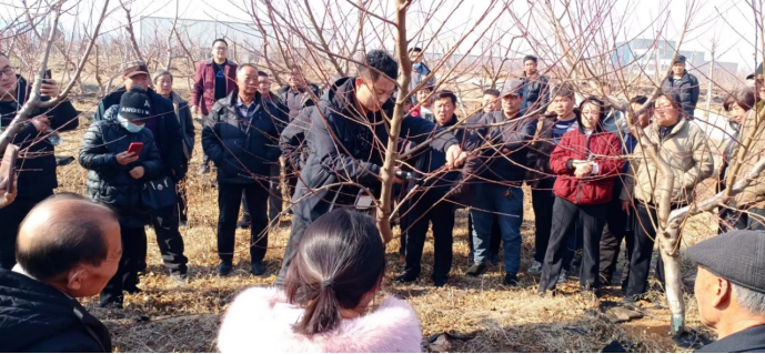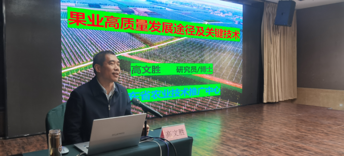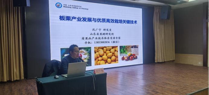 培训分两个阶段进行。在技术培训阶段,高文胜研究员围绕果业高质量发展途径及关键技术作了详细讲解,省果品产业技术体系首席专家、省果树研究所副所长沈广宁研究员、省农科院植保所研究员李丽莉和省果树研究所副研究员李桂祥等专家分别围绕板栗产业发展与优质高效栽培关键技术、桃树病虫害综合防控技术、桃新品种及生产关键技术等进行了专题授课。在现场教学阶段,组织参训人员到蒙阴县金葵农业科技有限公司现代桃产业示范基地开展现场教学。