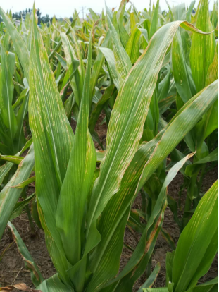 原因分析:玉米出现黄叶、白斑的主要原因是前两天的持续降雨造成的,由于降雨量较大,玉米地泡水现象普遍,部分土壤水分过饱和持续时间偏长,根系严重缺氧,吸收能力衰弱,根系出现沤根。且雨后出现天气骤晴,7月24日照强度高,蒸腾作用加强,水分供应不足,上不叶片出现灼伤,叶绿素收到破坏;另外,雨前用肥多的,加重根吸水障碍,干叶、白斑发生加重。玉米的大小不同,发生程度也有所差异,6-9叶期发生重,高大的玉米,因气生根发达,抗涝能力增强,发生轻。