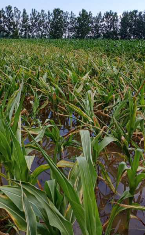 玉米一般玉米在立秋前后抽雄,现在多数已经进入穗分化的后期。此期受涝将严重影响穗子小花分化和性器官形成,也就是说,将会影响雄穗的小花数量、花粉数量和雌穗粒的分化,造成缺粒和秃尖,结实性差,甚至导致空秆。同时大量降雨会导致玉米纤维的韧性差、变脆,如遭遇大风天气易引发茎折和倒伏。
