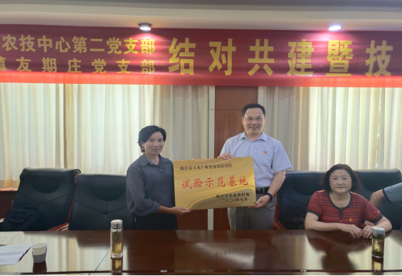 活动期间,农技中心二支部与友期庄村党支部结对搭建支部共建平台,本着“友好相处、资源共享、互相学习、相互协作、共同发展”的原则,双方签订了支部结对共建协议。农技中心二支部依托省现代农业水稻产业技术体系和临沂市玉米创新团队,以友期庄村为水稻玉米新品种新技术试验示范基地,提供新品种、技术培训、指导及有关技术服务。市农业农村局四级调研员宋中东同志、市农技中心副县级干部贺淑杉同志分别向友期庄村授予水稻、玉米试验示范基地牌子。