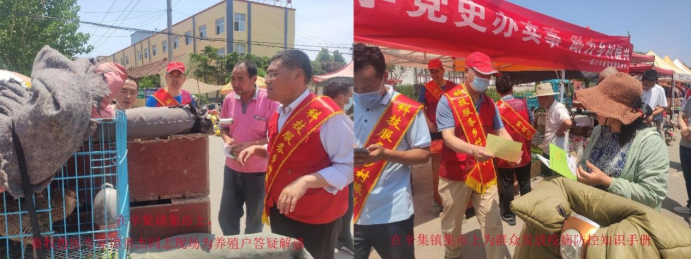 6月8日是农历四月廿八,正赶上辛集镇大集,第二党支部组织畜牧兽医专家谭善杰带领其他业务骨干党员在辛集镇大集上开展“畜牧科技下乡,赶科技大集”活动,为群众现场讲解动物防疫、饲料加工使用等知识,解答群众养殖中遇到的问题及咨询,发放畜牧养殖技术、重大疫病防控、饲料加工技术规范等宣传册子,做到用畜牧科技服务乡村振兴工作。