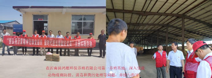 在鸿雁养殖基地,党员们与企业负责人深入交流了动物疫病防控、消毒和粪污处理等问题,就肉鸭养殖相关技术进行交流指导。在沂南中地牧业有限公司,党员们与企业负责人深入交流指导了奶牛饲养技术、动物疫病防控措施和无疫区建设等工作。给企业发放了消毒剂,强化夏季消毒灭源工作,加强动物疫病防控,还发放了无疫区建设知识问答手册,指导无疫省建设工作。
