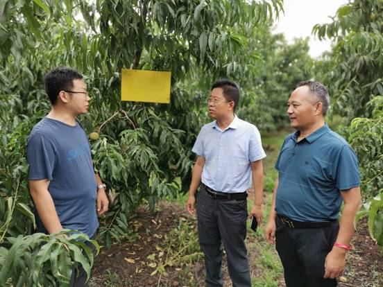2020年7月14日-15日,临沂市农科院果茶花卉研究所所长彭金海同青岛农业大学首席专家周洪旭教授、山东省果树研究所宫庆涛助理研究员、兰陵县环保站赵启超站长一行到临沂市农科院试验示范基地兰陵县香甜幸福源家庭农场、惠东社区千亩桃园基地、蒙阴县宝增果品专业合作社进行果树病害虫生态防控技术指导和专题调研。