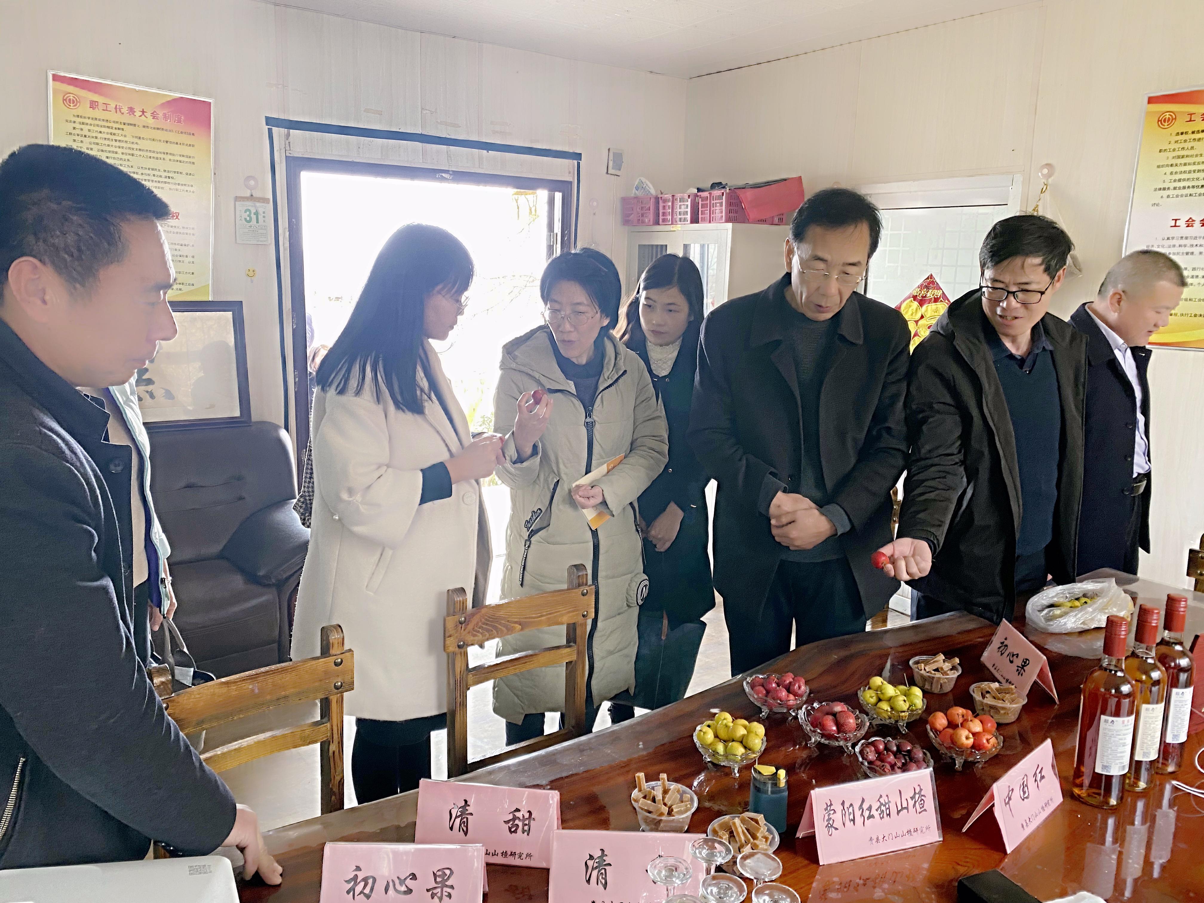 在费县大门山山楂研究所,研究所负责人聂宗省从不同山楂的引种改良、种植与推广、宣传与产品开发等方面作了介绍,希望针对不同山楂品种联合研发精深加工产品。农产品加工研究部主任张永涛建议,山楂具有季节性强、劳动密集的特点,建议培育适合机械化采收的山楂新品种,并研究配套机械化采收新技术,以便节省人工成本、提高作业效率;同时针对已育成山楂品种的不同功能特性,进行山楂精深加工、产品研发,增加产品核心竞争力,延伸产业链、提高附加值。