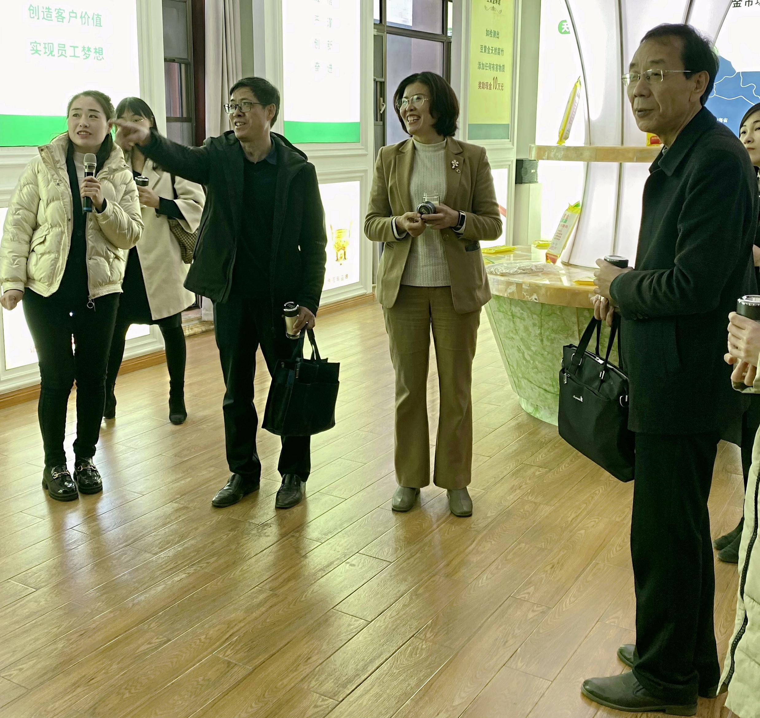 在豆黄金食品有限公司,参观了豆黄金天然鲜腐竹的文化展厅,了解了天然鲜腐竹的特性、生产过程、获得荣誉及合作厂商等,随后在座谈中,康德云董事长讲解了豆黄金的发展历程及未来思路,提出了鲜腐竹生产中副产品二道浆、豆渣再利用的研发需求,对此问题科技人员又进行了深入探讨。
