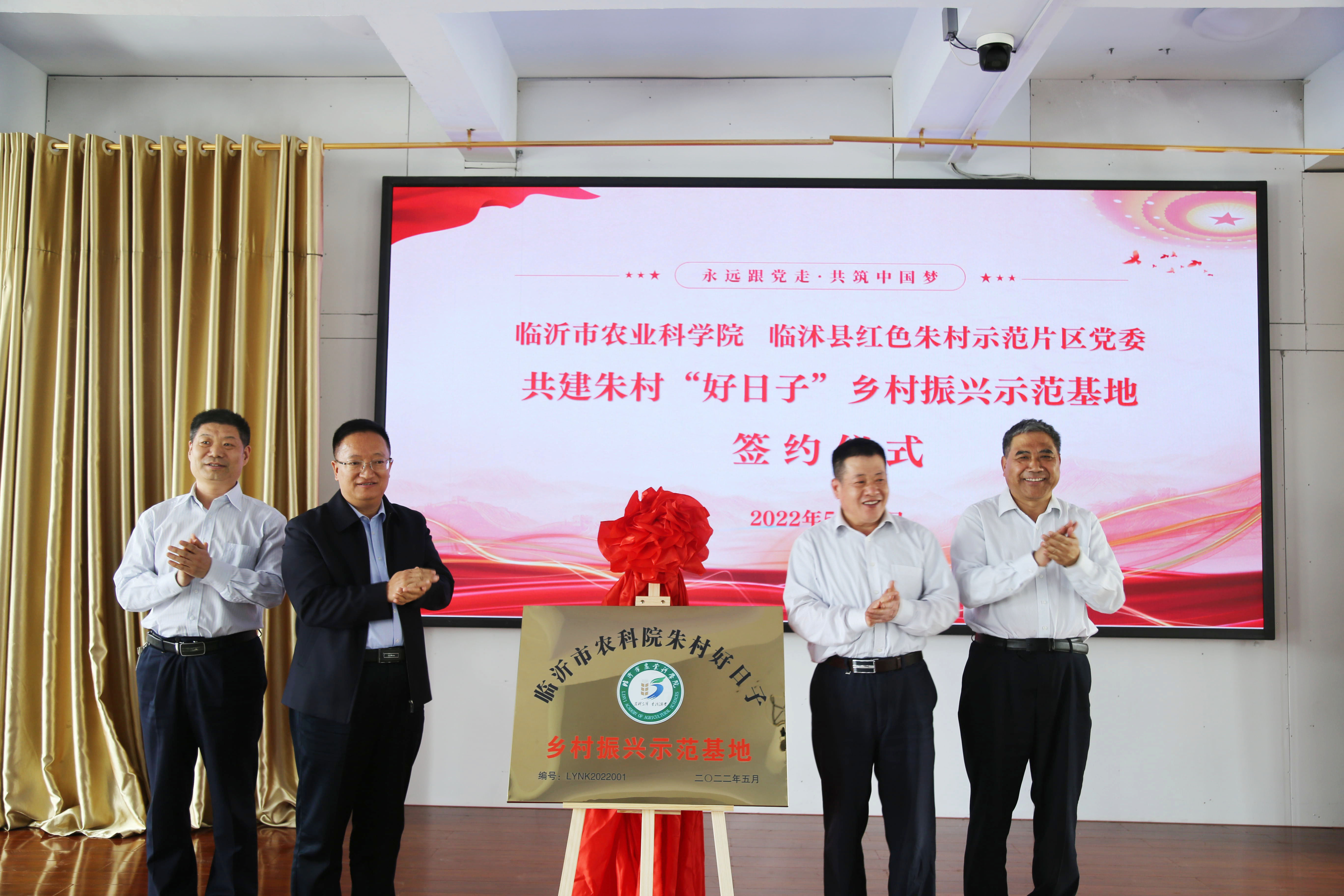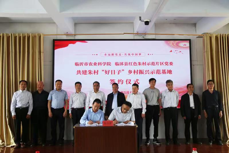 为进一步贯彻落实习近平总书记视察朱村提出的“让老区人民过上好日子”的重要指示精神,充分发挥临沂市农业科学院科研推广、专家人才和教育培训优势,助力朱村加快乡村振兴。5月18日,临沂市农业科学院与临沭县红色朱村示范片区党委共建朱村“好日子”乡村振兴示范基地签约揭牌仪式在朱村隆重举行。 临沂市财政局党组成员、市政府投融资服务中心副主任刘爱田,临沂市农业农村局副县级干部田文湘,临沂市农业科学院党委书记周绪元、院长张学兵,临沭县人大常委会主任王京凯,市派临沭县第一书记工作组大组长诸葛纪明等领导出席签约揭牌仪式。市农科院班子成员、科室部所负责人和创新团队首席,朱村示范片区10个村两委成员和经营主体负责人等参加签约揭牌仪式。