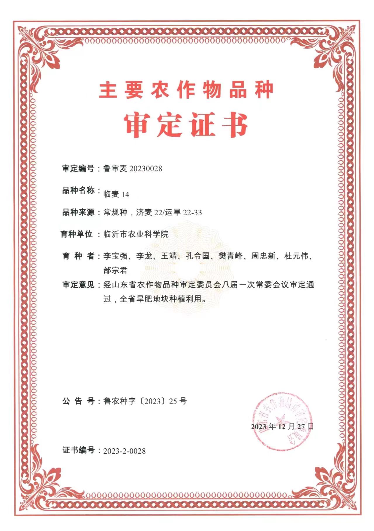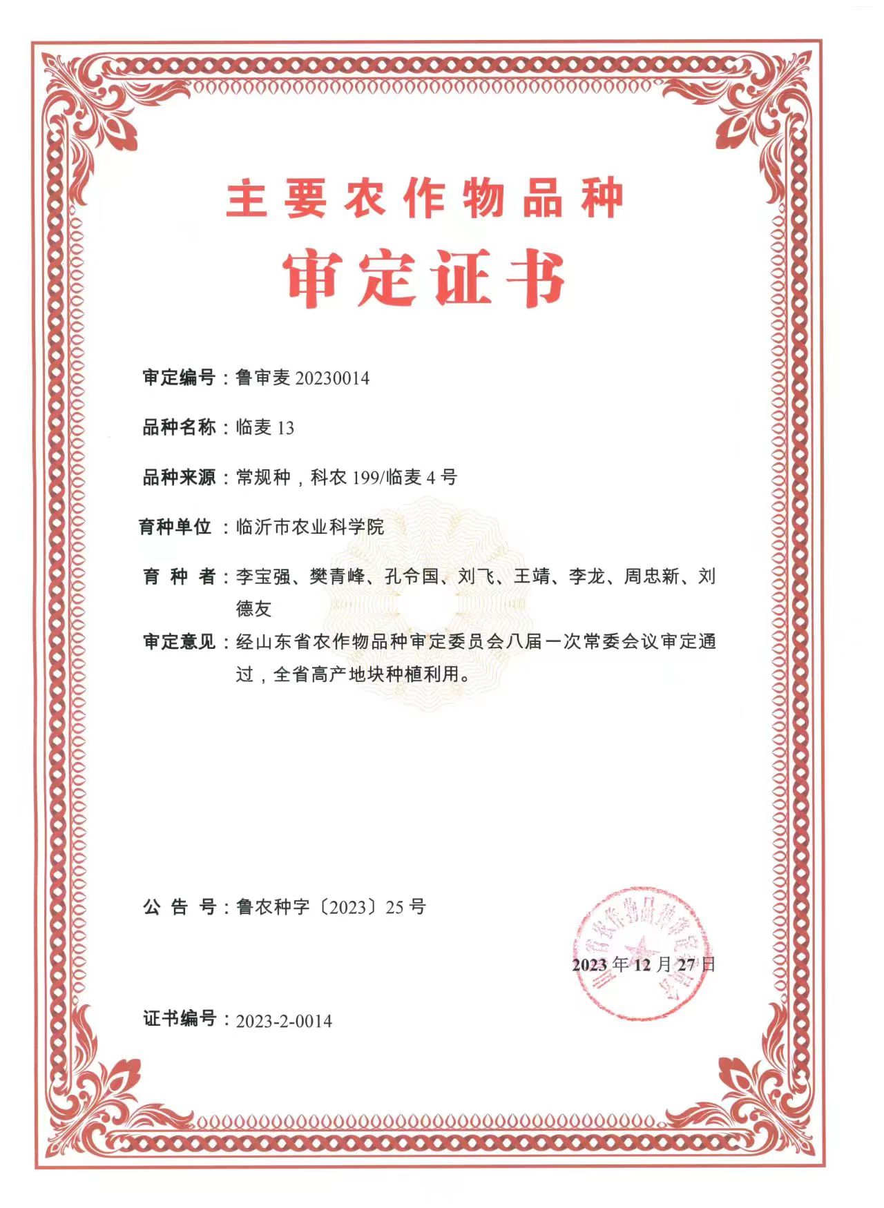 “临麦13”、“临麦14”是临沂市农业科学院杂交选育的小麦新品种,于2023年获得山东省审定,审定编号分别为鲁审麦20230014;鲁审麦20230028。