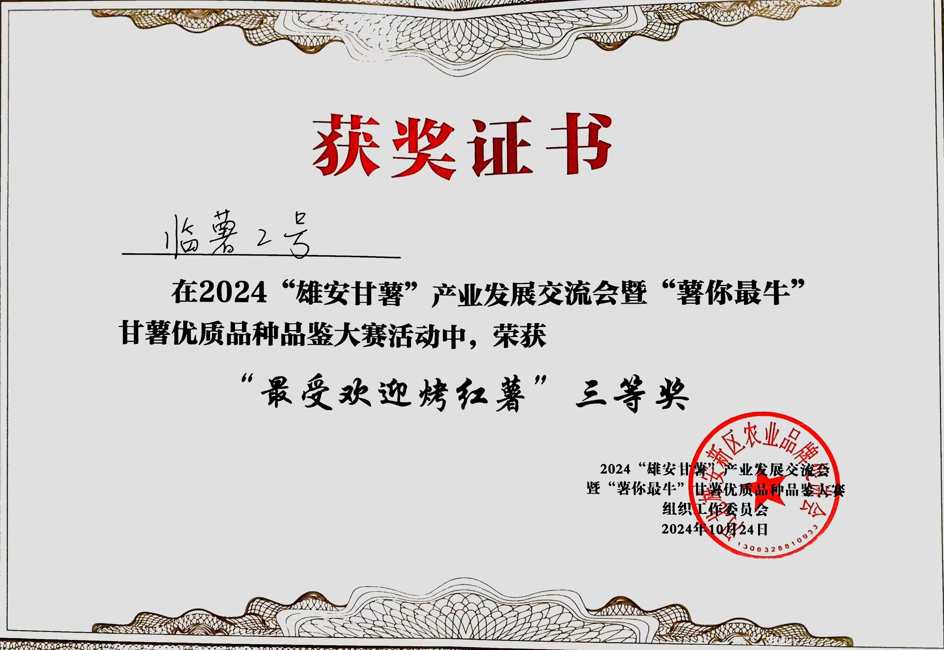 10月24日,为期两天的2024“雄安甘薯”产业发展交流会暨“薯你最牛”甘薯优质品种品鉴大赛圆满落幕。市农科院选育的临薯2号以其软糯香甜的口感脱颖而出,荣获“最受欢迎烤红薯”三等奖。