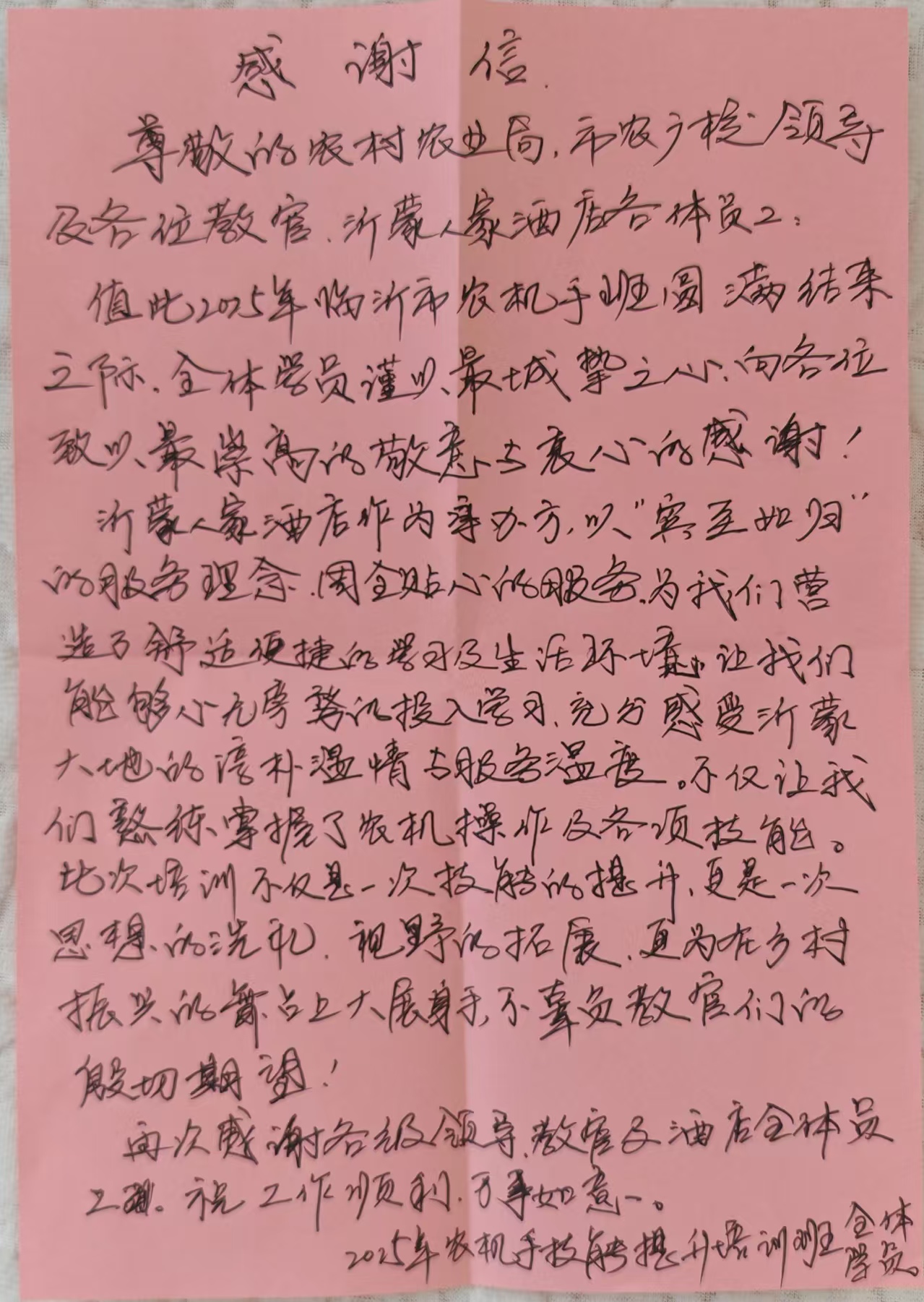 培训期间,学员们以饱满的学习热情、扎实的钻研学风、严明的纪律作风全身心投入,充分展现了临沂市高素质农民的精神风貌与职业风采。市农科院(农广校)与培训基地在组织协调、教学管理、后勤服务等方面精益求精,以扎实有效的工作赢得全体学员的高度认可,学员们专门撰写感谢信表达诚挚谢意,成为本次培训的暖心注脚。