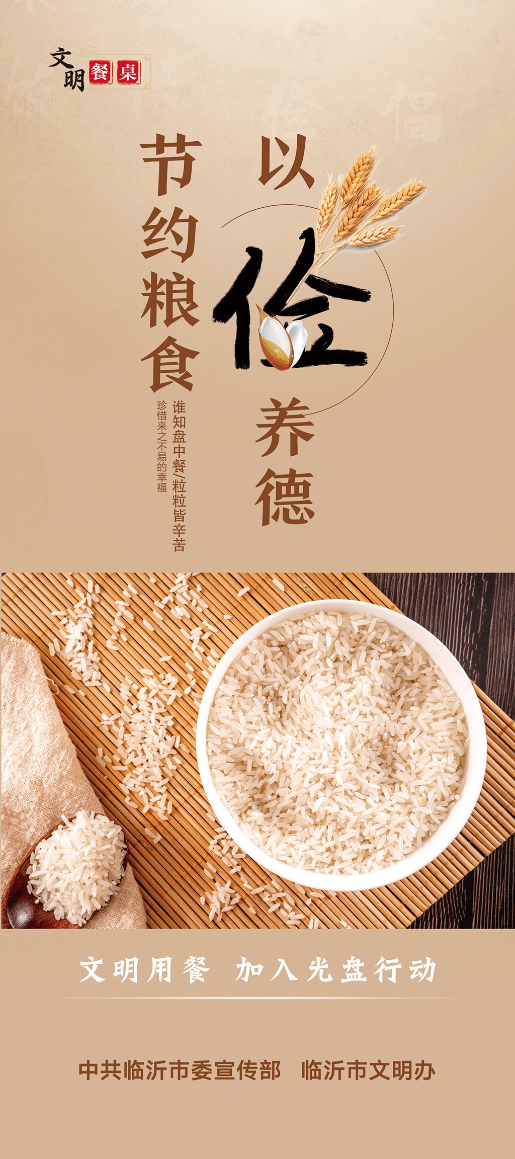 “光盘行动”看似小事,却承载着中华民族尊重劳动、勤俭节约的传统美德,是社会文明的重要体现。让我们立即行动起来,从我做起,从现在做起,自觉践行文明、健康、绿色、节约的生活方式,为提升城市文明形象、社会道德风尚、市民文明素质做出应有的贡献。