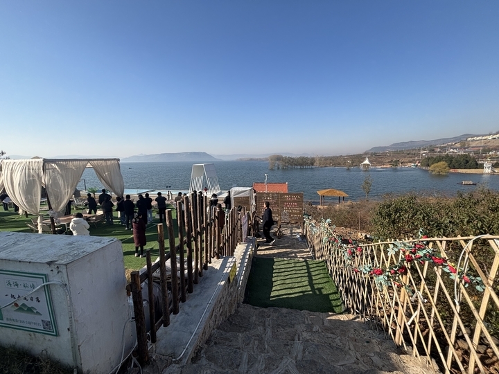 蔚蓝色的天空与深蓝色的湖水相接,岸边连片的草坪、帐篷与错落有致的古村落相映成趣,三五步便是小菜园,非遗手作摊位前不时传来孩子们的欢声笑语……秋日沂水县的跋山水库北岸,“洱海秘境”露营地的竹桌上,围炉煮茶的游客络绎不绝。